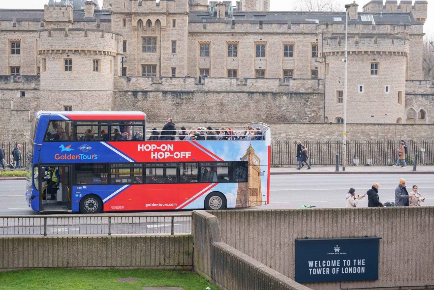 Golden Toursin henkilökunta ottaa sinut vastaan St. Pancras International -asemalla. Sieltä sinut ohjataan läheiselle bussipysäkille, josta voit nousta Hop-on Hop-off -kiertoajelubussiin.
