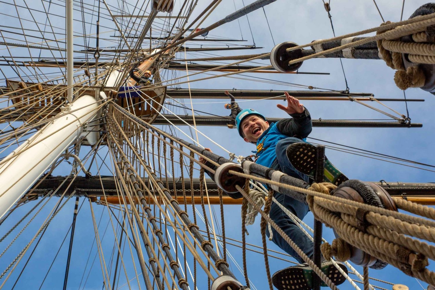 Начав с брифинга под красивым корпусом корабля, те, кто достаточно смел, чтобы принять вызов, направляются на главную палубу и забираются на «крысиные тросы» корабля (веревочные лестницы).